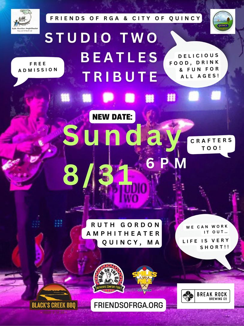 Mark your calendars for this Sunday, 8/31 at 6pm. Ending the season with a night to remember by Studio Two Beatles Tribute — New England’s best!! “All you need is love” as the song says 🎼 and a great free night of amazing music under the stars at the iconic RGA… 💕